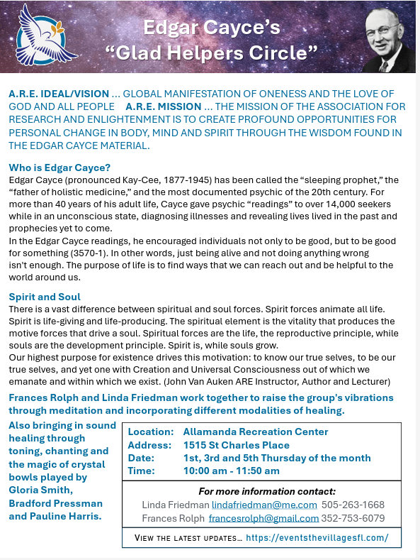 September 8, 2025September 8, 2025 Rosamaria Edgar Cayces’ “Glad Helpers Circle” Share this: Click to share on X (Opens in new window) X Click to share on Facebook (Opens in new window) Facebook Like Loading... Related