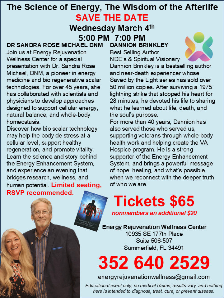 February 8, 2026February 8, 2026 Rosamaria The Science of Energy, The Wisdom of the Afterlife with Dr. Sandra Rose Michael and Dannion Brinkley Energy Rejuvenation Wellness Center as you enjoy a FREE Energy Enhancement Session Share this: Share on X (Opens in new window) X Share on Facebook (Opens in new window) Facebook Like Loading... Related