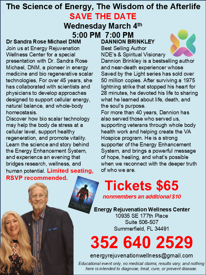 February 11, 2026February 11, 2026 Rosamaria The Science of Energy, The Wisdom of the Afterlife with Dr. Sandra Rose Michael and Dannion Brinkley Energy Rejuvenation Wellness Center as you enjoy a FREE Energy Enhancement Session Share this: Share on X (Opens in new window) X Share on Facebook (Opens in new window) Facebook Like Loading... Related