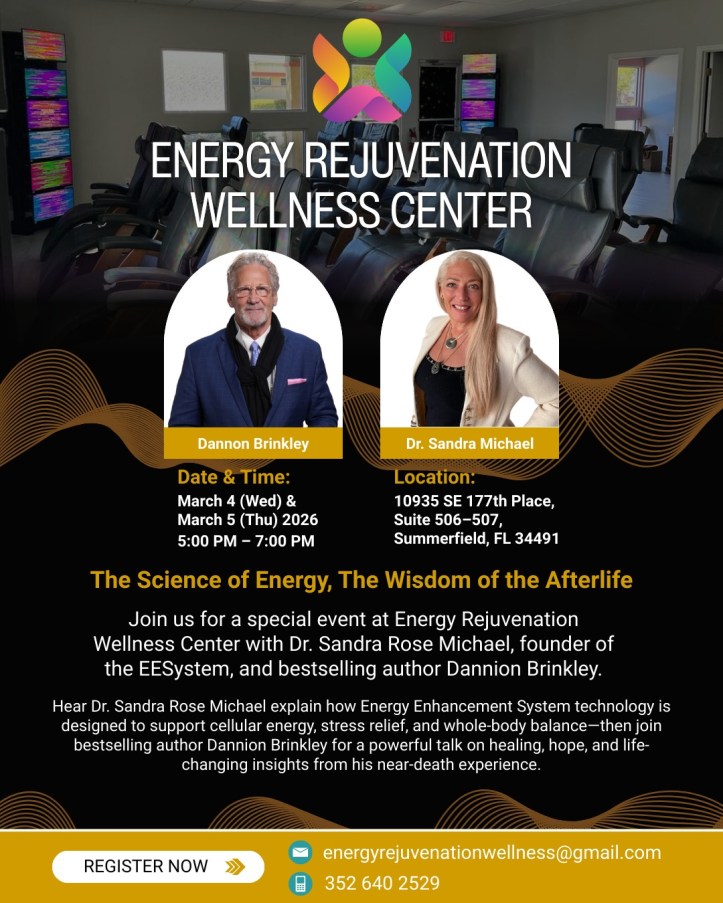 March 5, 2026March 5, 2026 Rosamaria CALL TODAY STILL SPACE AVAILABLE for The Science of Energy, The Wisdom of the Afterlife with Dr. Sandra Rose Michael and Dannion Brinkley Thursday, March 5th – 5:00 to 7:00 PM Energy Rejuvenation Wellness Center – enjoy a FREE Energy Enhancement Session Share this: Share on X (Opens in new window) X Share on Facebook (Opens in new window) Facebook Like Loading... Related